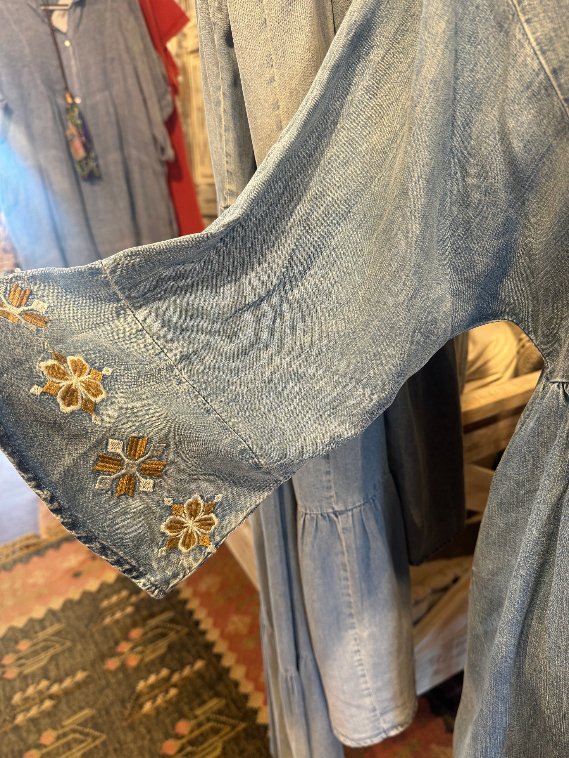 Denim dress, with accented floral designs is a big YES!!! So cute for church, date night, special event, shopping or just wanting to wear a CUTEEE fit! Pairs great with some off-white or brown boots, or even sandals! V neck, & sleeves are 3/4 length! Dress hits around knee area!