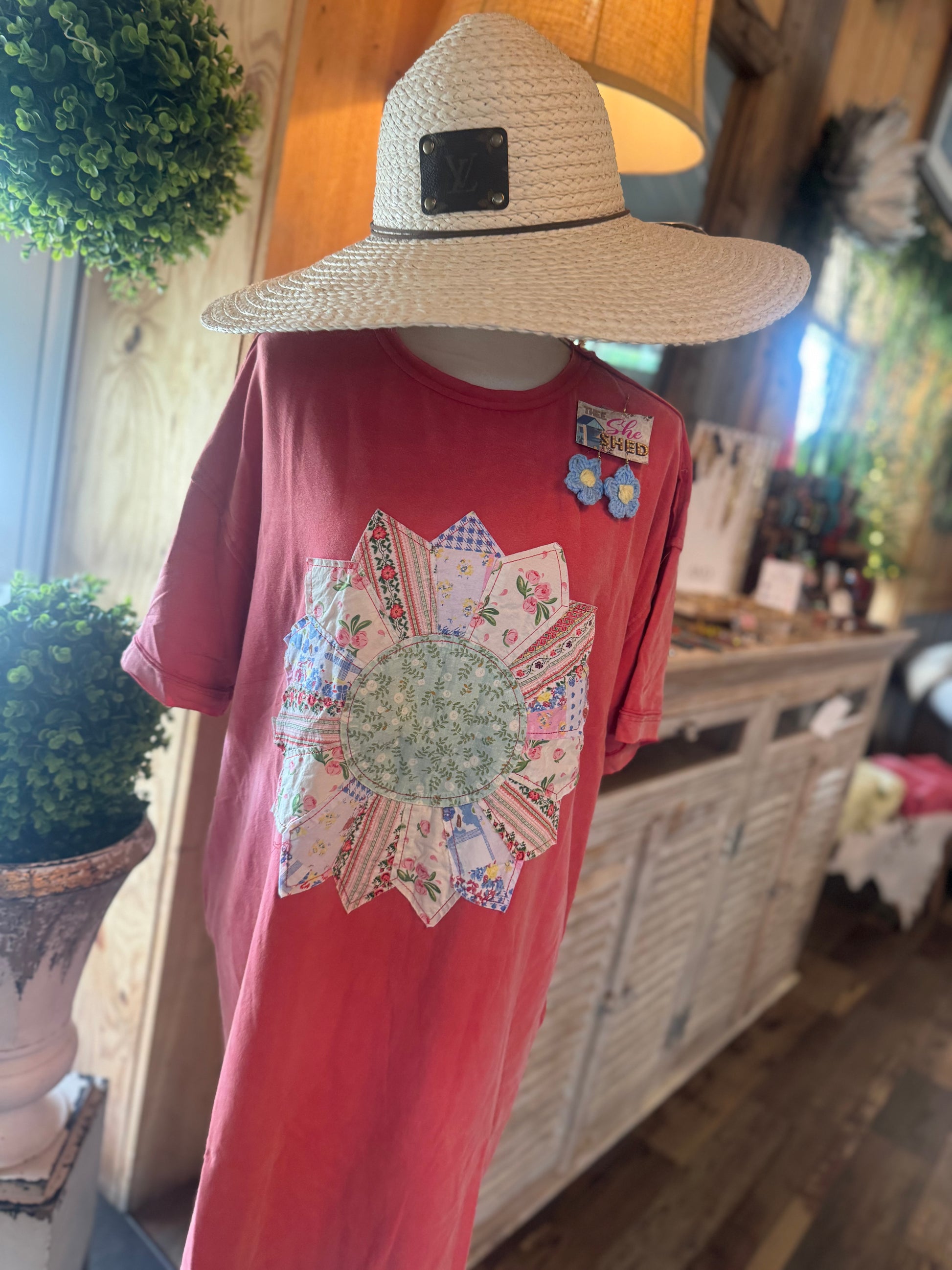 Boho red flower dress is comfy & unique with its patchwork, quilted flower! This color is screaming summer & the design just adds the perfect finishing touch! Easy to throw on and go! Dress it up or dress it now!