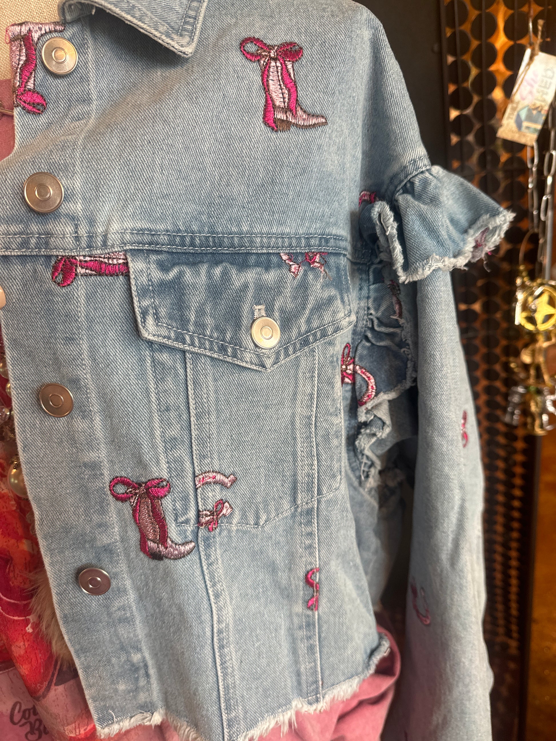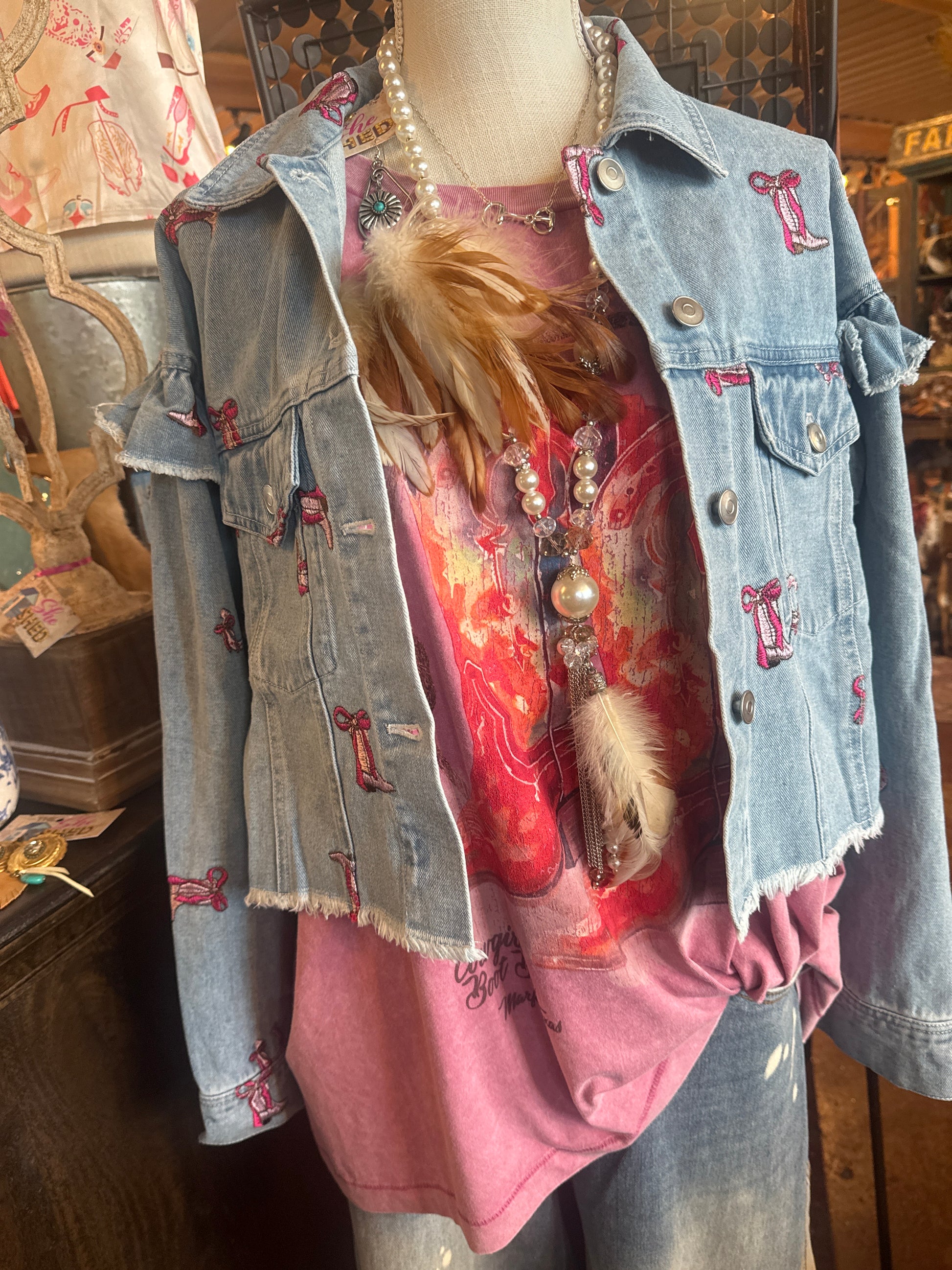 Calling all western girlies, who not only love all things cowgirl, but want to add a little prep in your fit as well! Look no further, this jacket is IT! Denim with a little ruffle on the tops of the sleeves and embroidered boots with boys all over it! This jacket is SOOO cute and speaks for itself!! This jacket is a cropped fit! LOVE LOVE LOVE!!!