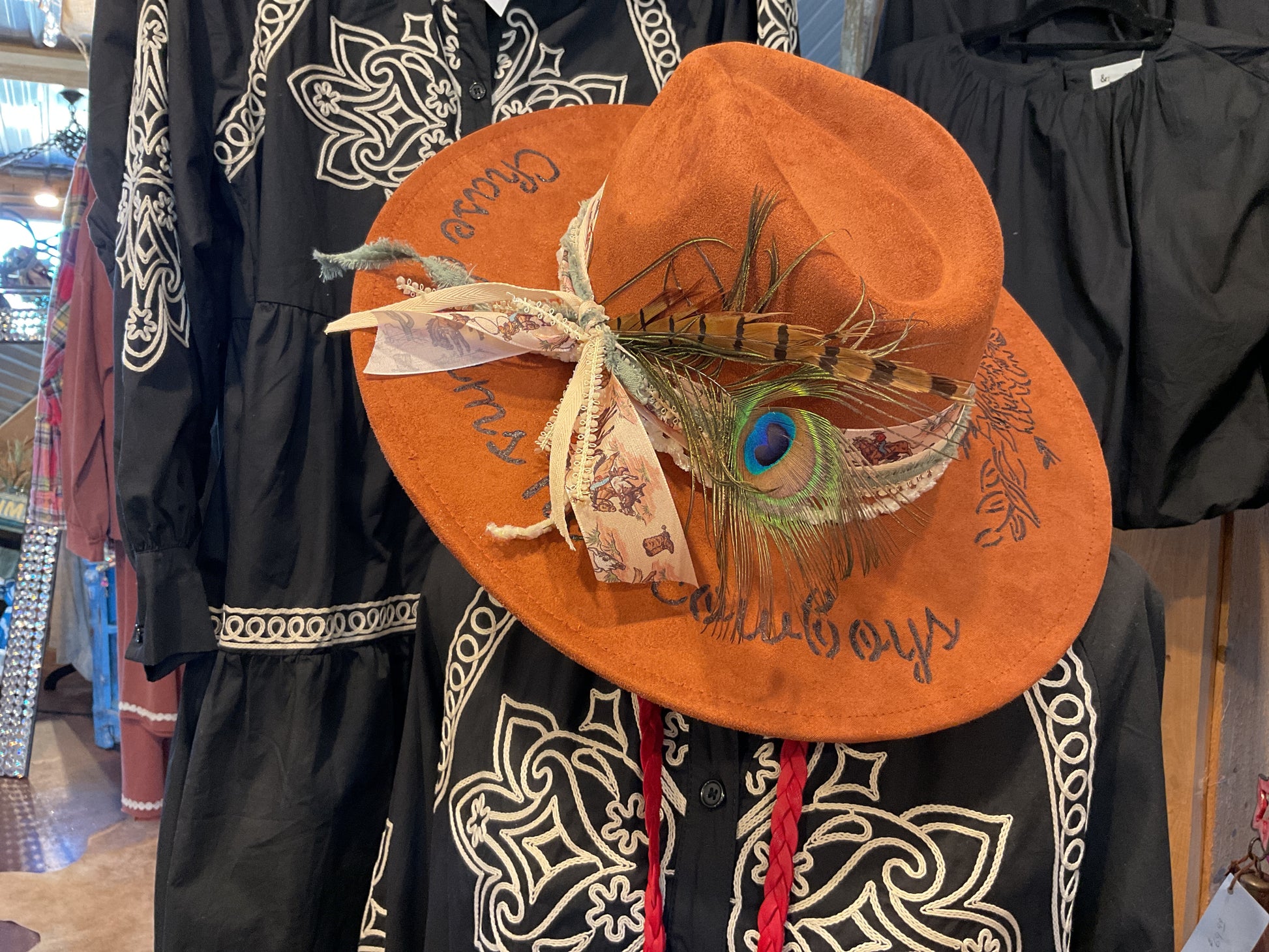 Custom hat….”Chase Dreams Not Cowboys” all dolled up with some western designs, cute ribbon, plus a peacock and pheasant feather!! This hat is adjustable as well! Go ahead and add some style to your fit!!