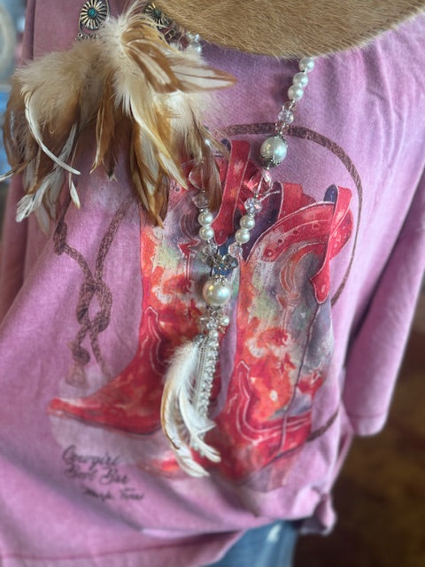 Mauve boot bar tee is soooo pretty with it’s cowgirl boots and alllll the splashes of color added, with a painted look to it! Can’t forget this tee has POCKETS as well! Runs oversized!